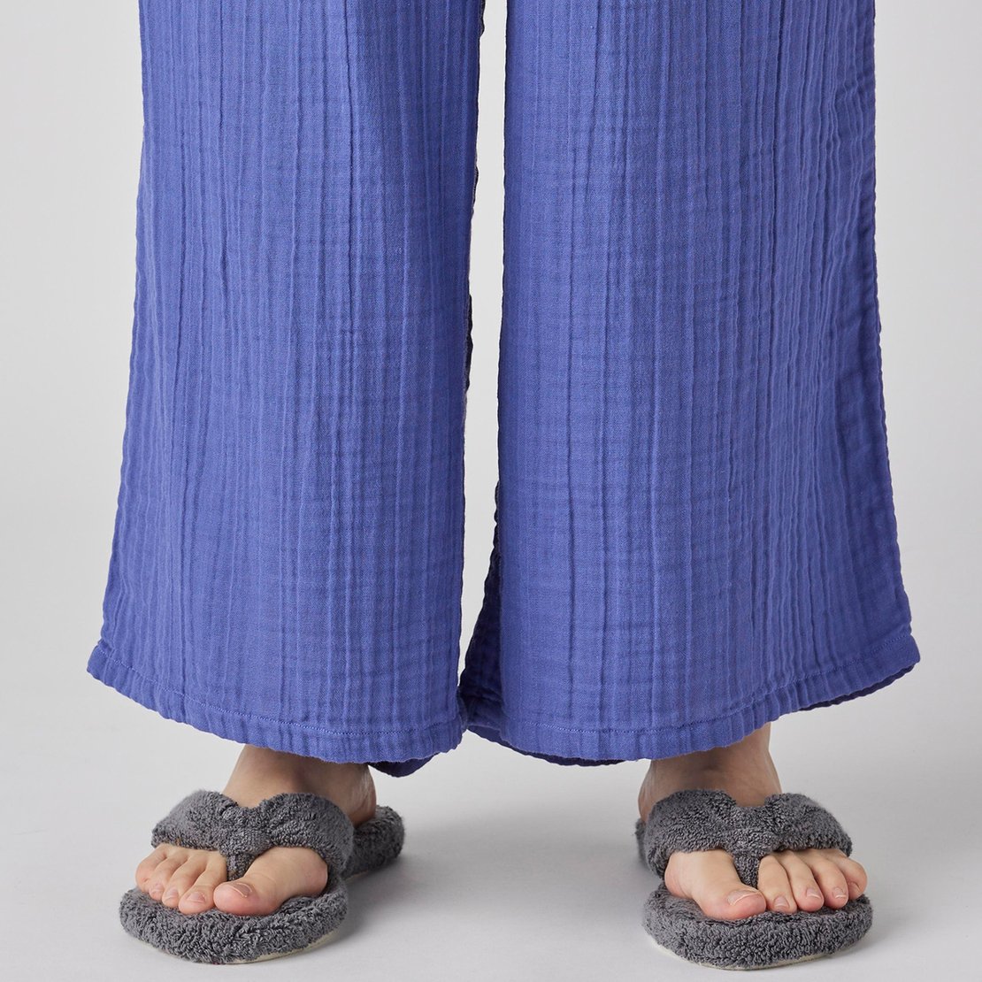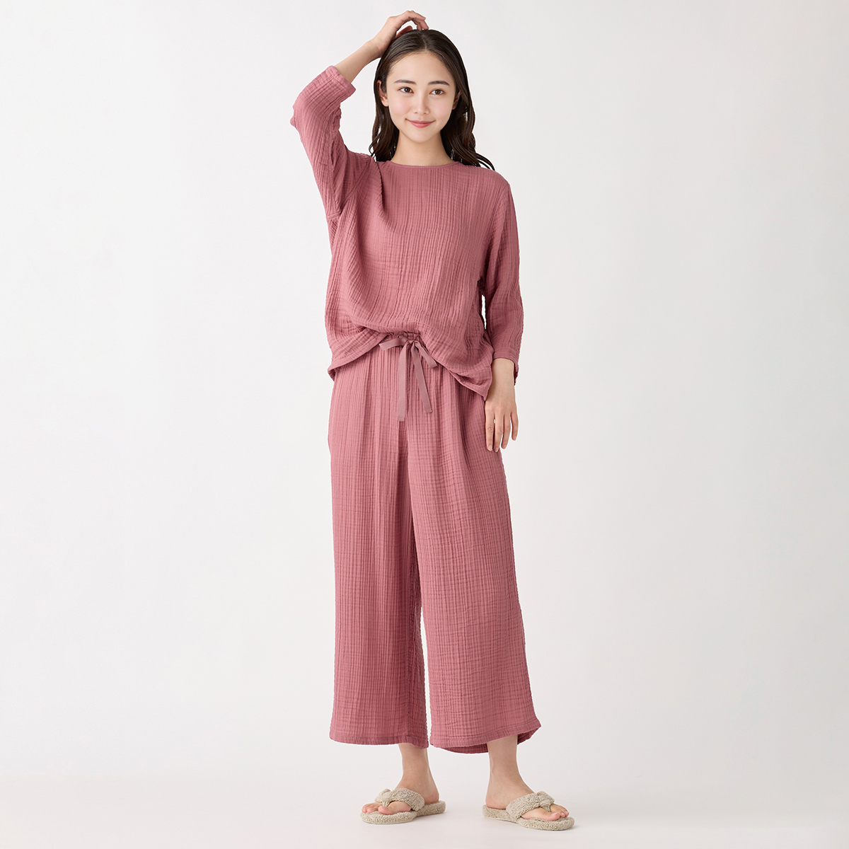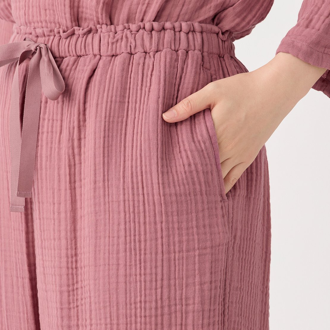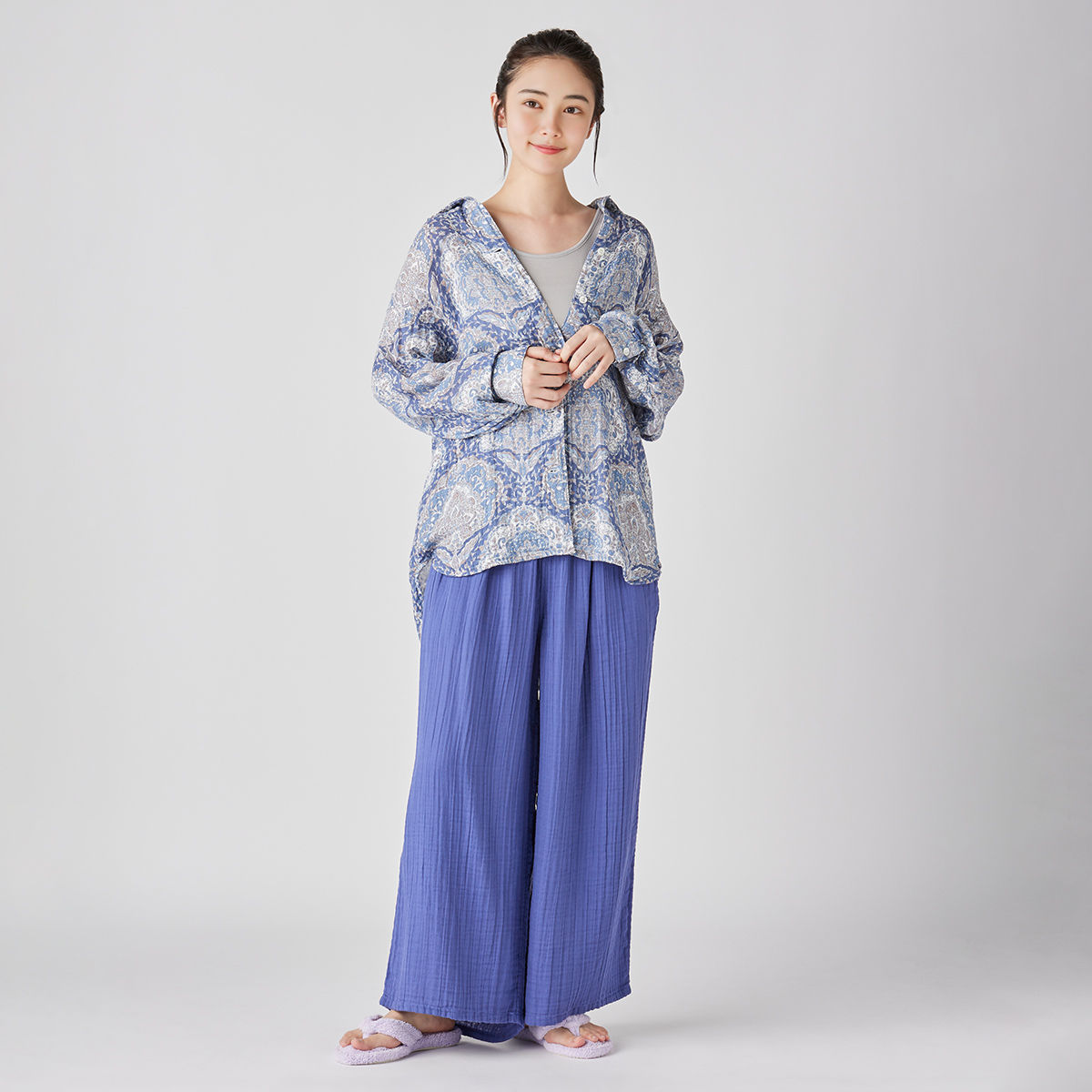 This three-ply gauze has a pleasantly light feel with natural shrinkage and wrinkles. In addition to being light and breathable, the unevenness of the fabric means that the area in contact with the skin is small, making it light and comfortable to wear. The simple design makes it suitable not only for use in the room but also for outside wear. It is also lightweight and folds easily, making it convenient to carry on trips.