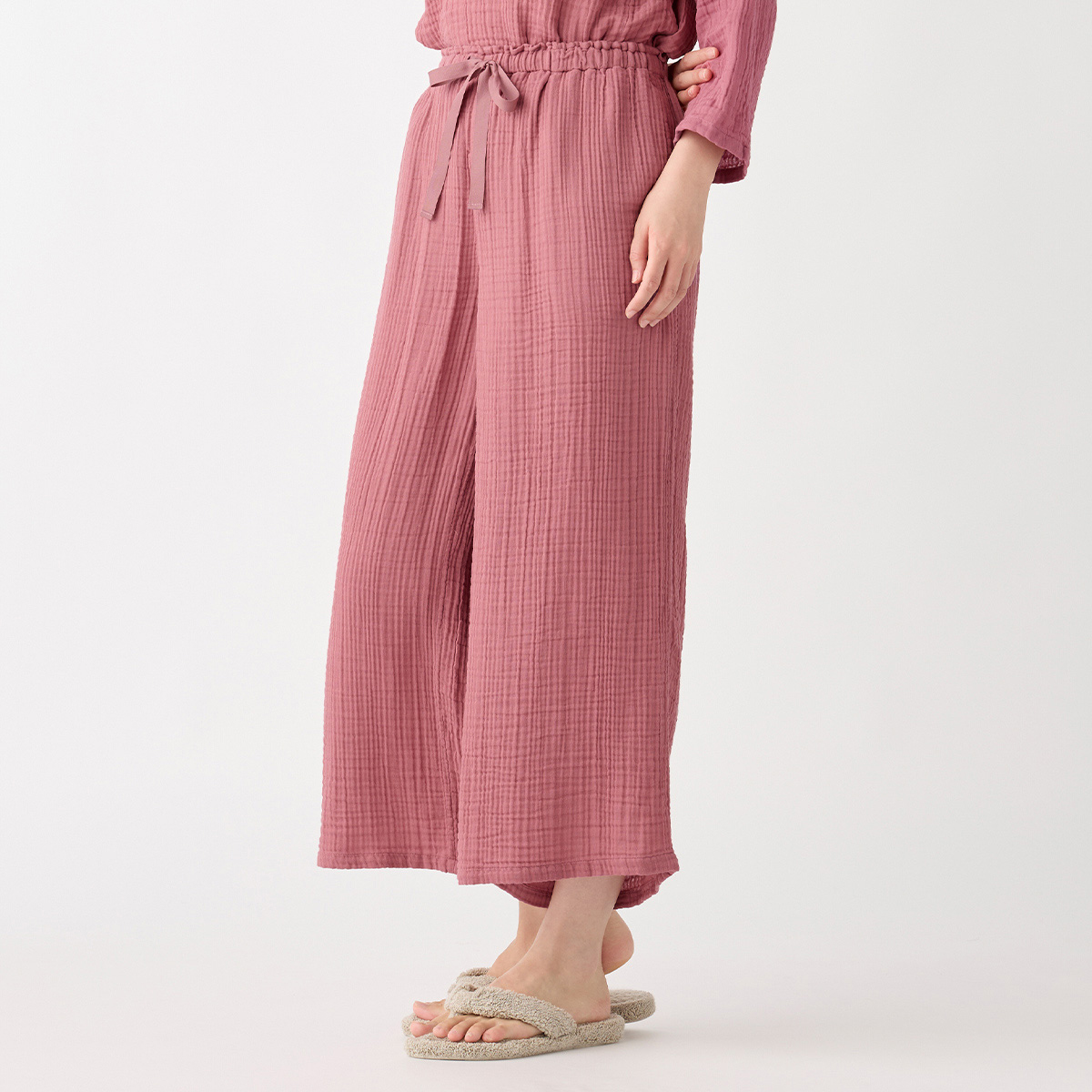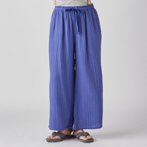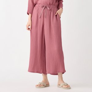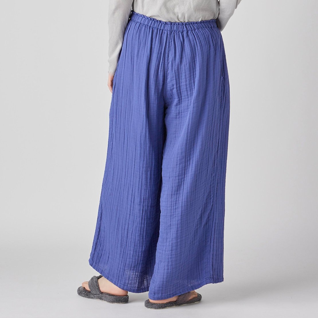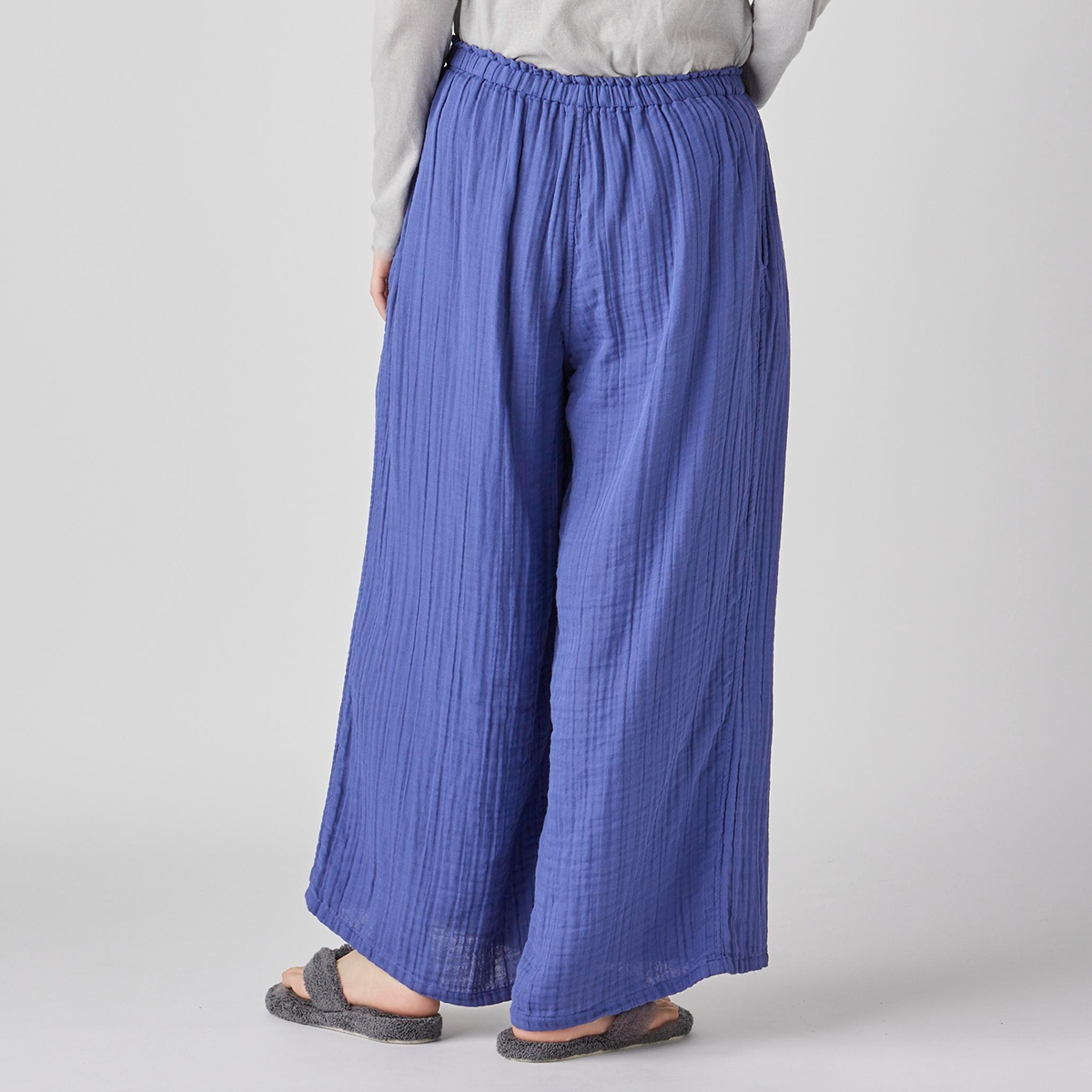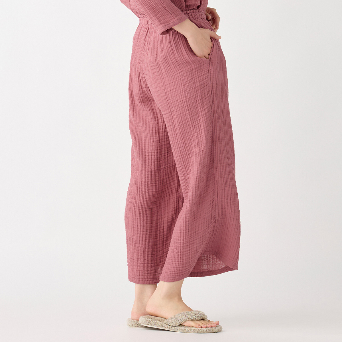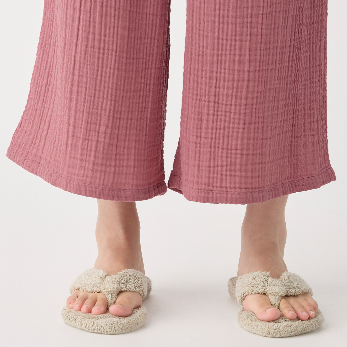 This three-ply gauze has a pleasantly light feel with natural shrinkage and wrinkles. In addition to being light and breathable, the unevenness of the fabric means that the area in contact with the skin is small, making it light and comfortable to wear. The simple design makes it suitable not only for use in the room but also for outside wear. It is also lightweight and folds easily, making it convenient to carry on trips.