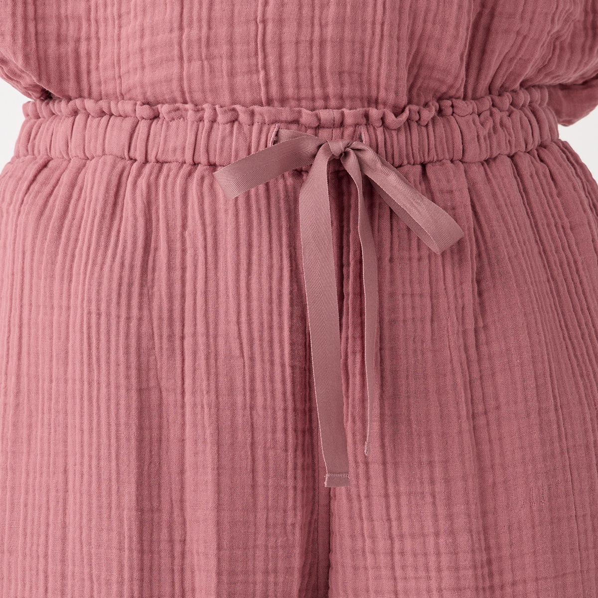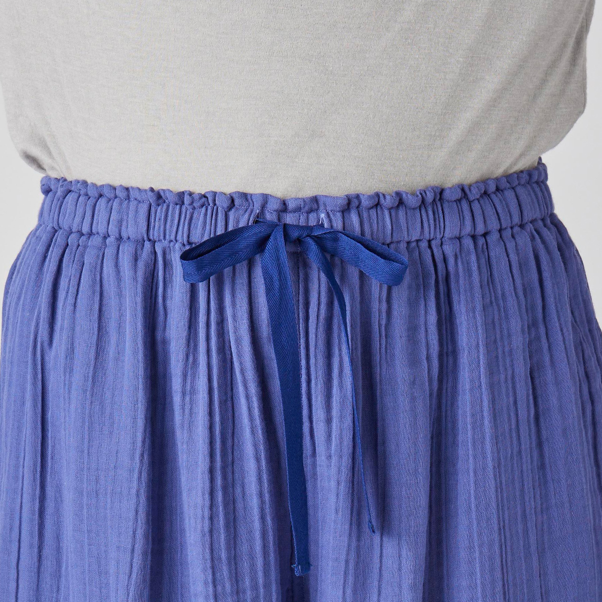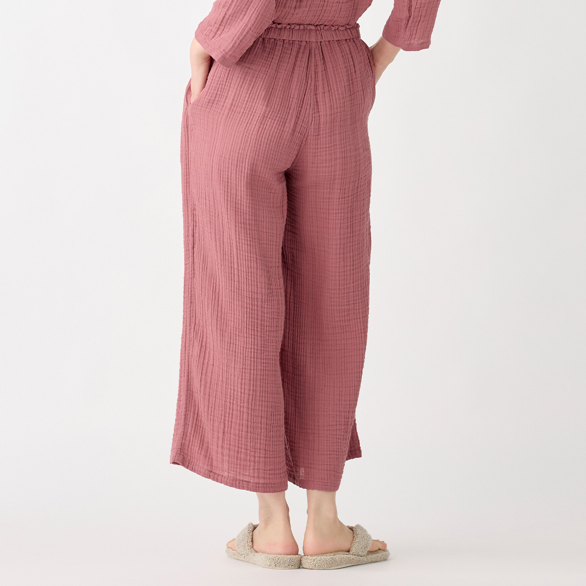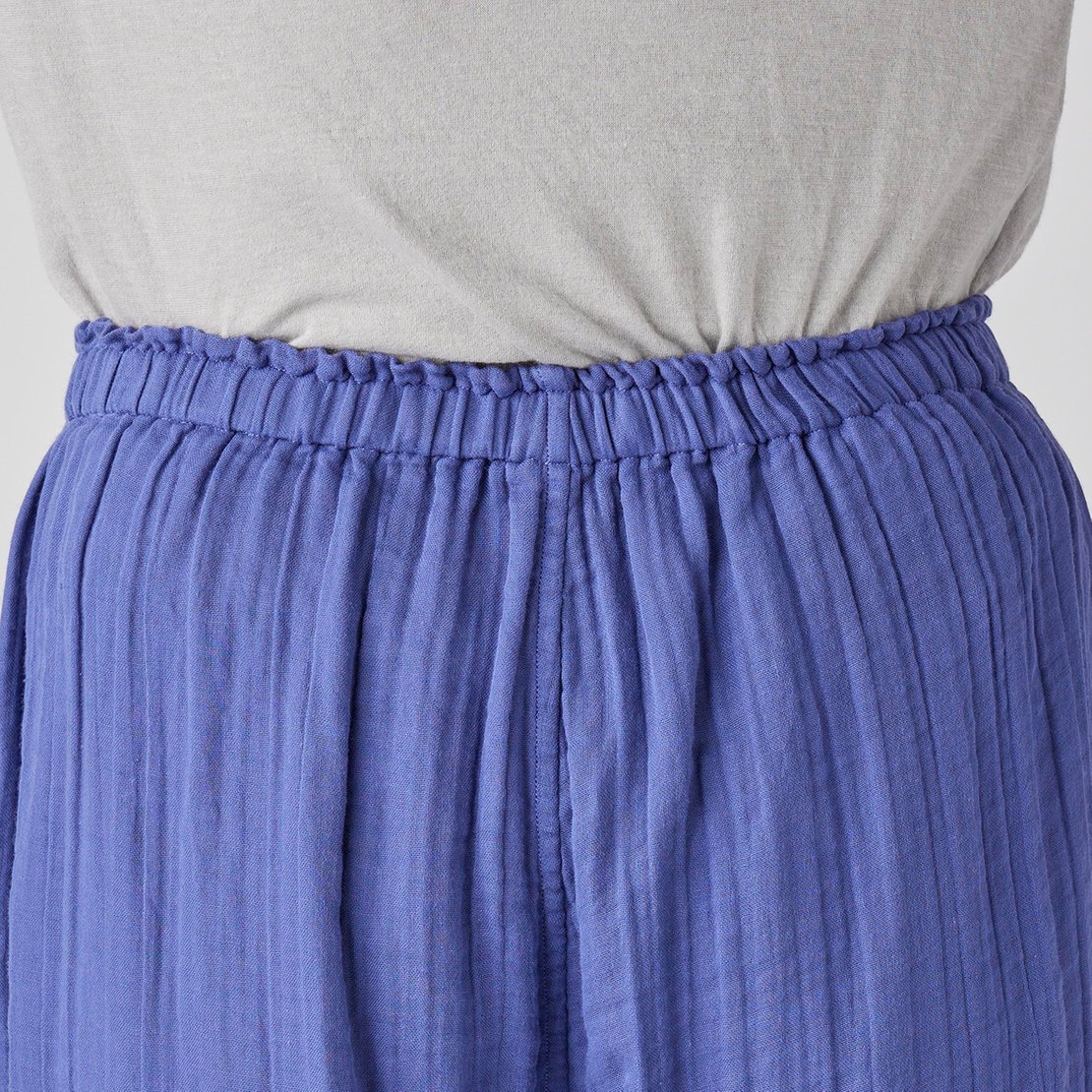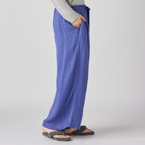 This three-ply gauze has a pleasantly light feel with natural shrinkage and wrinkles. In addition to being light and breathable, the unevenness of the fabric means that the area in contact with the skin is small, making it light and comfortable to wear. The simple design makes it suitable not only for use in the room but also for outside wear. It is also lightweight and folds easily, making it convenient to carry on trips.