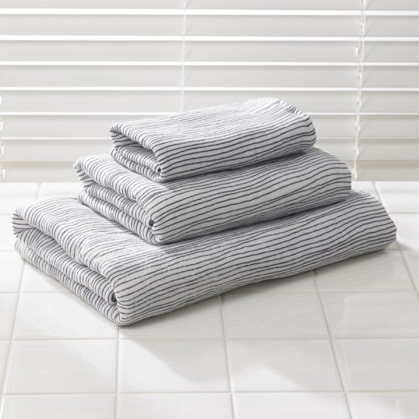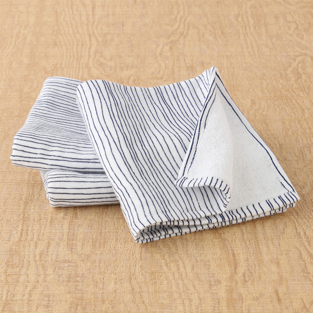 Among the various patterns of Kyo Komon, we chose a Komon pattern that expresses wavy curves called yoroke-shima. The material is a light and quick-drying single-sided gauze. The pile surface is made of untwisted yarn, so it is soft and fluffy to the touch.